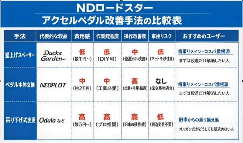 私の結論としては、NDロードスターのキャラクターを活かすなら、まずはDucks Garden製のスペーサーで様子を見るか、予算が許すならNEOPLOT製のアクセルペダルNEOへの交換を強く推奨します。特にNEOPLOT製品は、メリット3で解説した「軌道補正」の効果が顕著で、コントロール性の向上は数値以上の感動があります。
