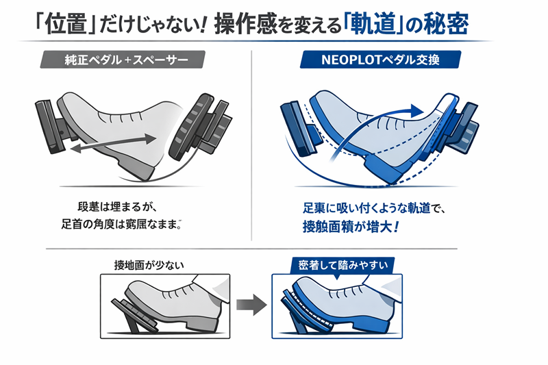 純正ペダルには、万が一の踏み間違いを防ぐための「安全マージン(段差)」が設けられています。しかし、スポーツ走行においてはこのマージンが操作の阻害要因となることがあります。まずは物理的な操作性がどう変わるのか、3つのメリットを見ていきましょう。