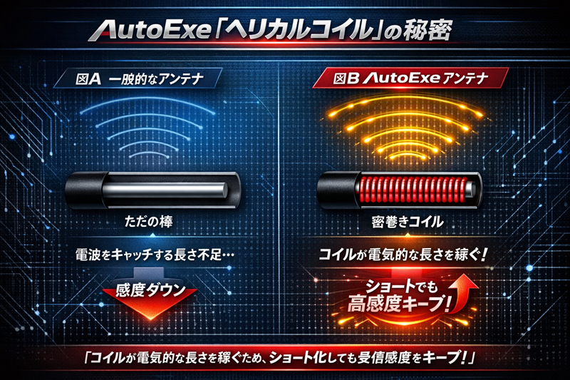 AutoExeのアンテナには「ヘリカルコイル」が内蔵されており、これが物理的な長さ不足を電気的に補完する役割を果たしています。