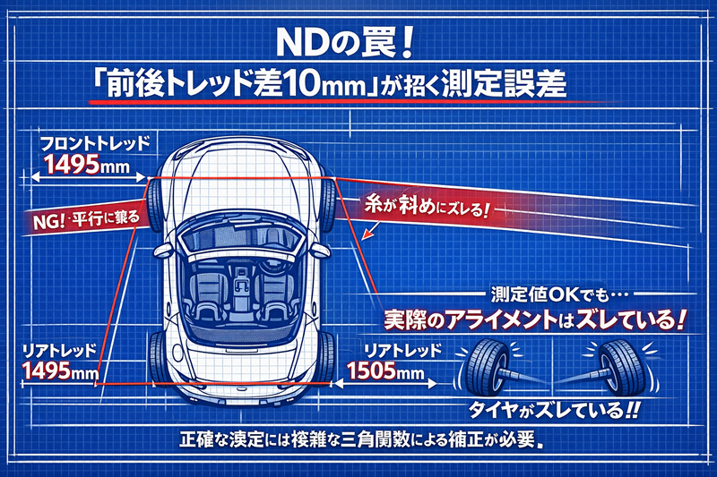 - ND特有の「前後トレッド差」が、DIY計測の大きな落とし穴になる。