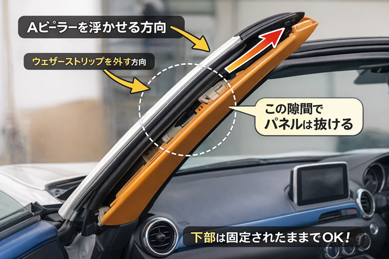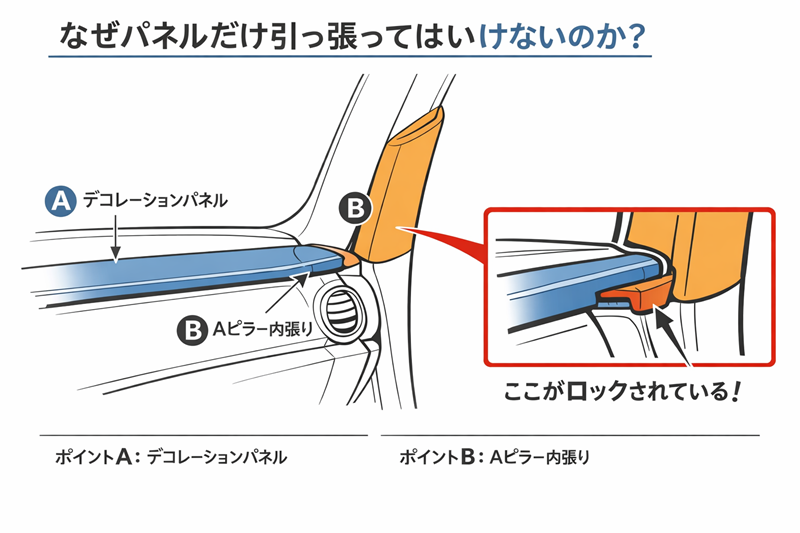 実は、デコレーションパネルの左端は、Aピラー(フロントピラー)の内張りの下に入り込んでいる構造になっています。つまり、デコレーションパネルを外すには、その上を覆っているAピラーの操作が構造的に必須なのです。