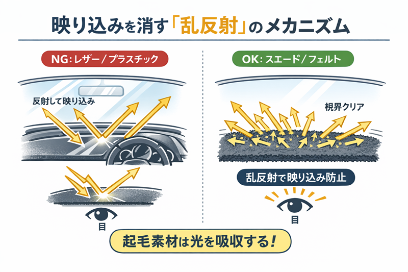 これらの素材は表面の微細な毛羽立ちが光を乱反射・吸収するため、物理的に映り込みを無効化するベストな素材と言えます。特に「ウルトラスエード(アルカンターラ)」は、高級車の内装にも採用されるほど優れた吸光性と質感を兼ね備えています。