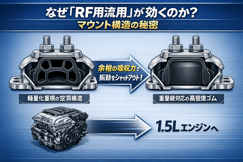 • RF用純正マウント: 重い2.0Lエンジンを支えるため、ゴムの密度が高く、容量に余裕を持たせた設計になっています。