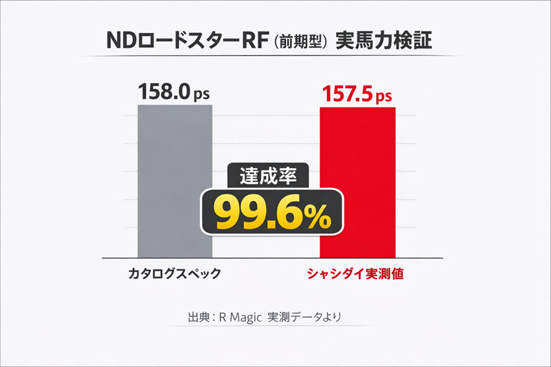 通常、市販車の実測馬力は駆動ロスや測定環境の影響で、カタログ値の90%程度出れば優秀とされます。しかし、RFの実馬力とカタログスペックの関係は、ほぼイコールであるという検証結果が出ています。達成率にして99.6%。これは、マツダがカタログ数値を「盛って」いないことの何よりの証明です。