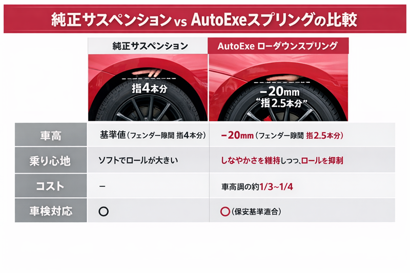 通常、ローダウンスプリングと乗り心地はトレードオフ(二律背反)の関係にありますが、AutoExeの製品はこの問題を巧みに解決しています。