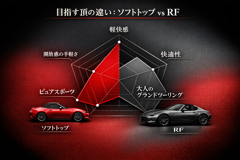 しかし、ここで重要なのは、マツダ・ロードスターRFとマツダ・ロードスター(ソフトトップ/幌)は、そもそも目指している「頂(いただき)」が全く異なるという事実です。
