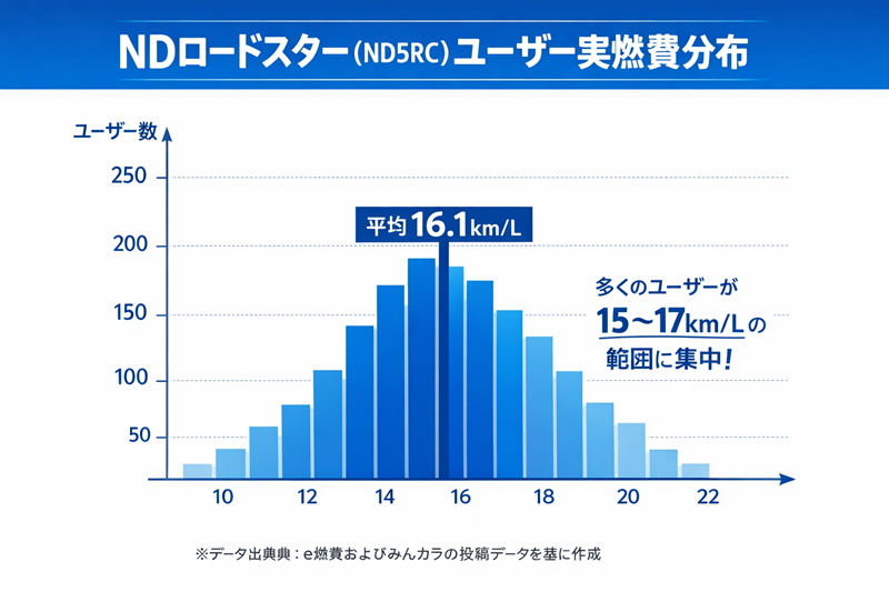 大手燃費情報サイト「e燃費」のデータを参照すると、NDロードスター(MTモデル)の実燃費平均は16.1km/Lを記録しています。これは、カタログ燃費(WLTCモード 16.8km/L)との乖離が非常に小さいことを意味します。