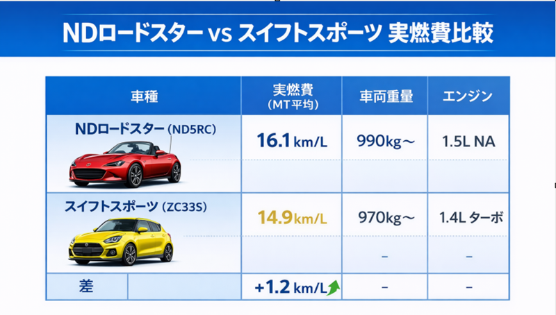 1つ目:NDロードスターのライバル「スイフトスポーツ」より燃費が良い衝撃の事実