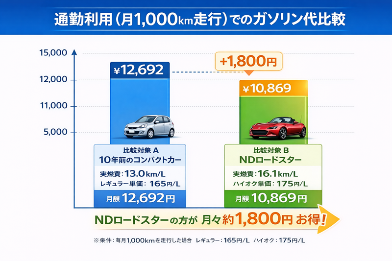 ここで、あなたが(そして奥様が)最も懸念している点に触れましょう。「でも、ロードスターはハイオク仕様でしょ? ガソリン単価が高いから、結局お金がかかるんじゃないの?」という疑問です。