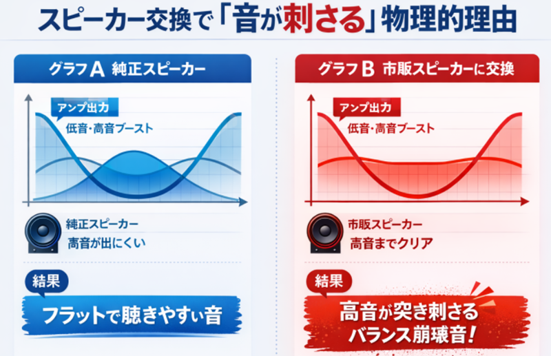 - EQ補正のミスマッチ: 純正アンプはオープン走行用に高音・低音を強烈にブーストしています。ここに高音再生能力の高い市販スピーカーを繋ぐと、ブーストされた高音がそのまま再生され、「耳に刺さるようなキンキンした音」になってしまいます。