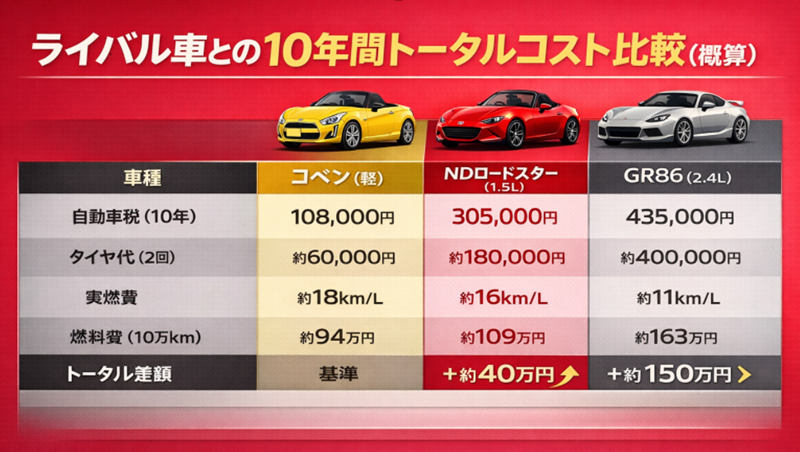 確かに軽自動車のコペンは安いです。しかし、NDロードスターとの差額は10年で約40万円。月にならすと約3,500円の差しかありません。