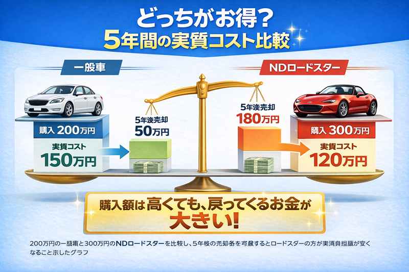 「高いロードスターの方が、結果的に安く乗れる」。これが、資産価値の高い車を選ぶ最大のメリットです。